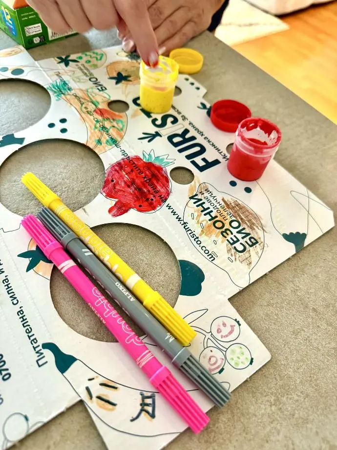 Хартията, която използваме за опаковките, е гланцирана и е трудна (дори невъзможна) за оцветяване с моливи. Препоръчваме ви да използвате флумастри или водни бои.